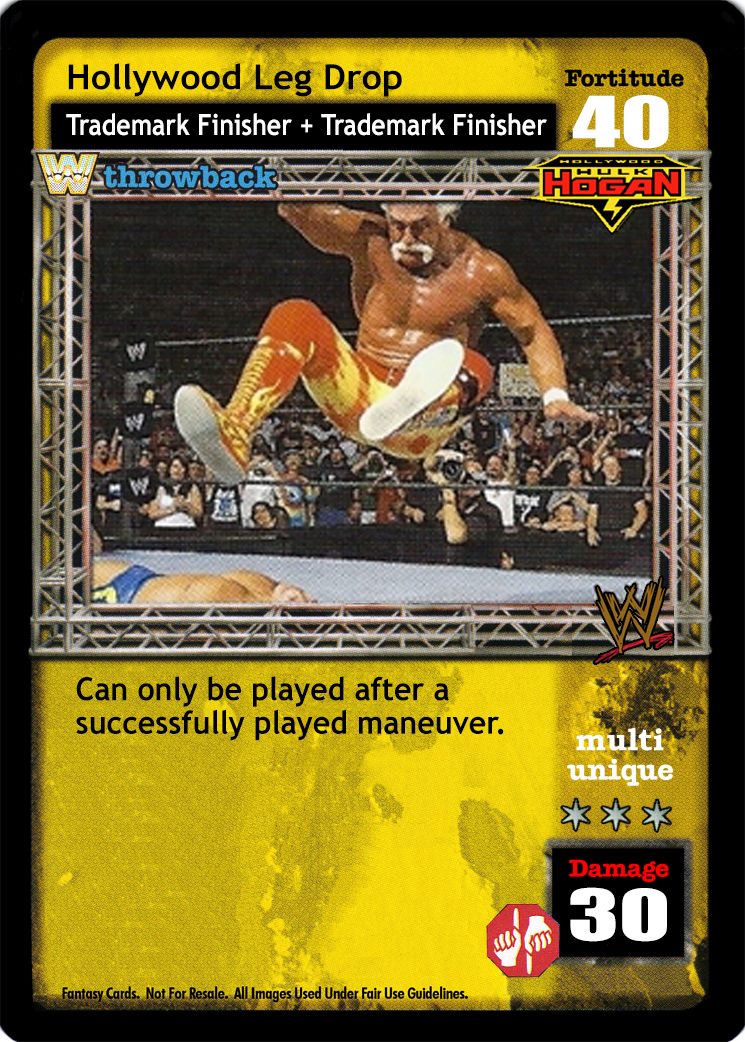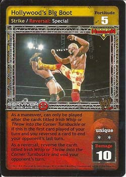 As a maneuver, can only be played after the cards titled Irish Whip or Throw into the Corner Turnbuckle or if this is the first card played of your turn and you reversed a card to end your opponent's last turn. As a reversal, reverse the cards titled Irish Whip or Throw into the Corner Turnbuckle and end your opponent's turn.