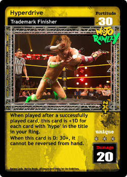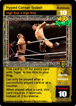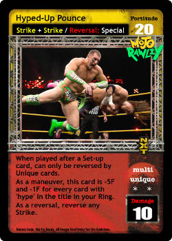When played after a Set-up card, can only be reversed by Unique cards. As a maneuver, this card is -5F and -1F for every card with 'hype' in the title in your Ring. As a reversal, reverse any Strike.