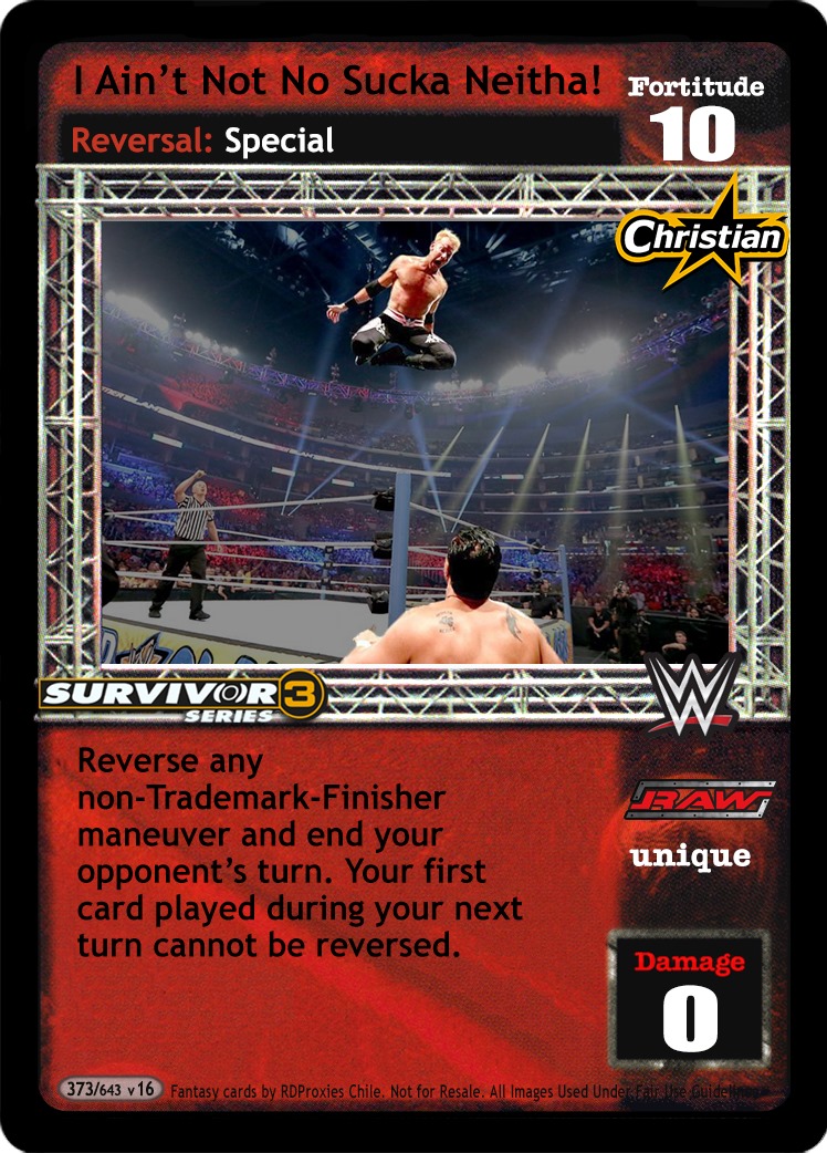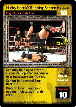 Can only be played after a successfully played maneuver or a superstar-specific card. Cannot be reversed from Backlash. Discard 1 card, and your opponent discards 1 random card.