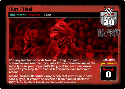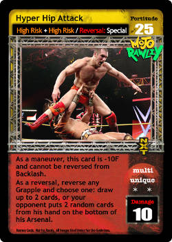 As a maneuver, this card is -10F and cannot be reversed from Backlash. As a reversal, reverse any Grapple and choose one: draw up to 2 cards, or your opponent puts 2 random cards from his hand on the bottom of his Arsenal.