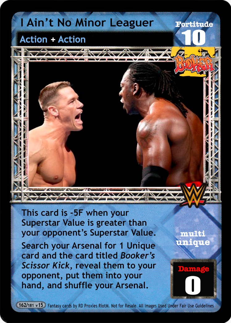 This card is -5F when your Superstar Value is greater than your opponent's Superstar Value. Search your Arsenal for 1 Unique card and the card titled Booker's Scissor Kick, reveal them to your opponent, put them into your hand, and shuffle your Arsenal.