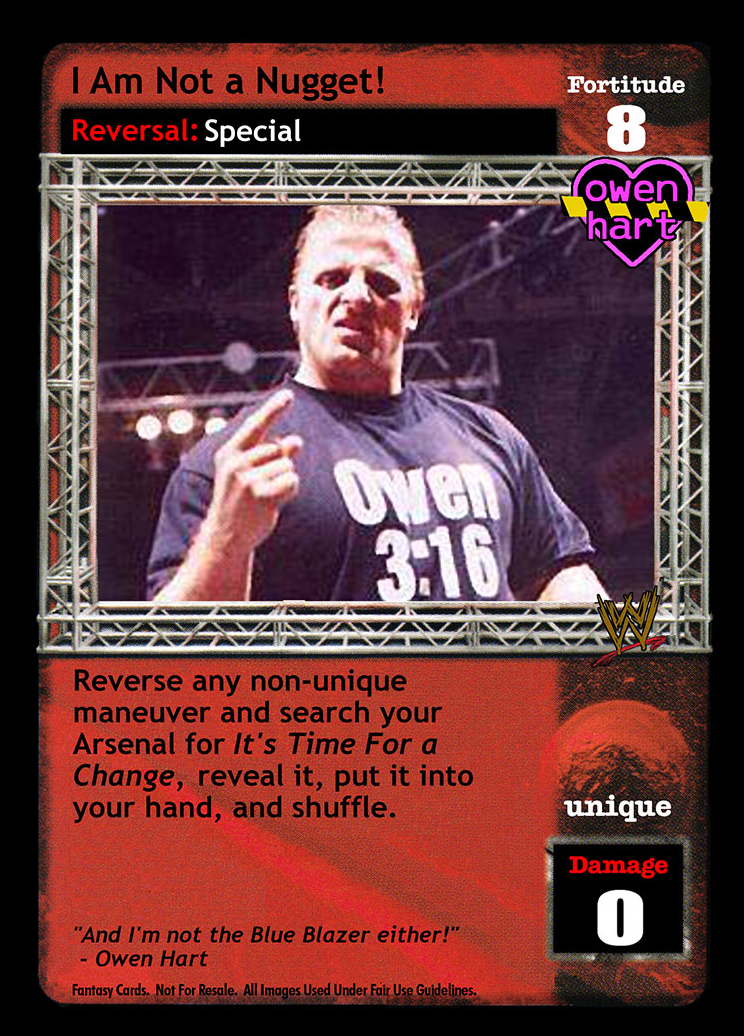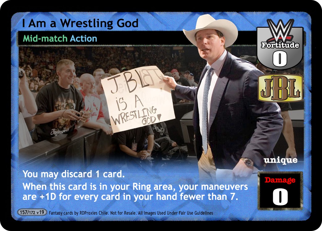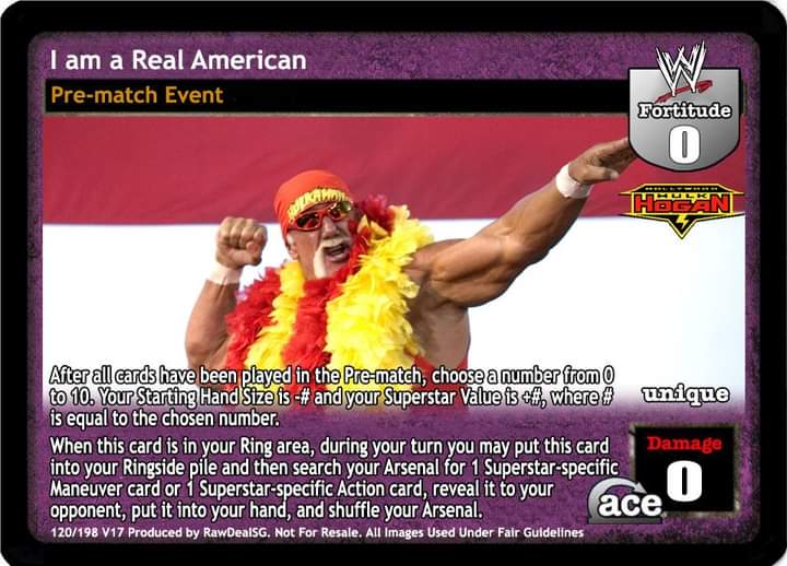 After all cards have been played in the Pre-match, choose a number from 0 to 10. Your Starting Hand Size is -# and your Superstar Value is +#, where # is equal to the chosen number. When this card is in your Ring area, during your turn you may put this card into your Ringside pile and then search your Arsenal for 1 Superstar-specific Maneuver card or 1 Superstar-specific Action card, reveal it to your opponent, put it into your hand, and shuffle your Arsenal.