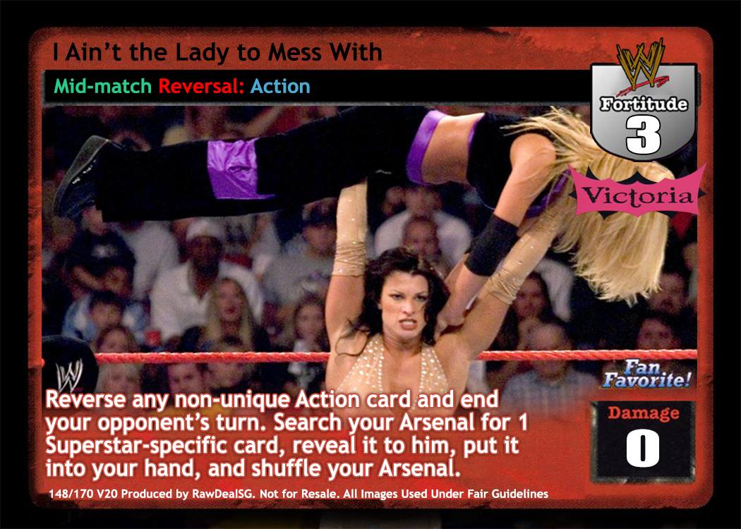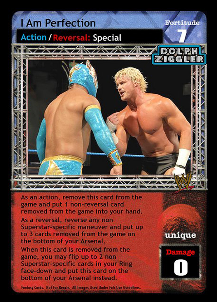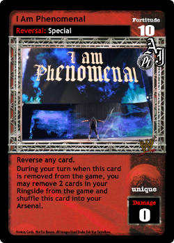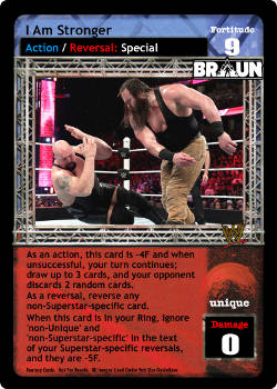 As an action, this card is -4F and when unsuccessful, your turn continues; draw up to 3 cards, and your opponent discards 2 random cards. As a reversal, reverse any non-Superstar-specific card. When this card is in your Ring, ignore 'non-Unique' and 'non-Superstar-specific' in the text of your Superstar-specific reversals and they are -5F.