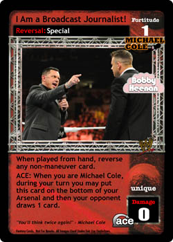 When played from hand, reverse any non-maneuver card. ACE: When you are Michael Cole, during your turn you may put this card on the bottom of your Arsenal and then your opponent draws 1 card.