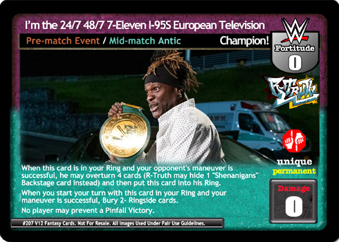 When this card is in your Ring and your opponent's maneuver is successful, he may overturn 4 cards (R-Truth may hide 1 'Shenanigans' Backstage card instead) and then put this card into his Ring. When you start your turn with this card in your Ring and your maneuver is successful, Bury 2- Ringside cards. No player may prevent a Pinfall Victory.