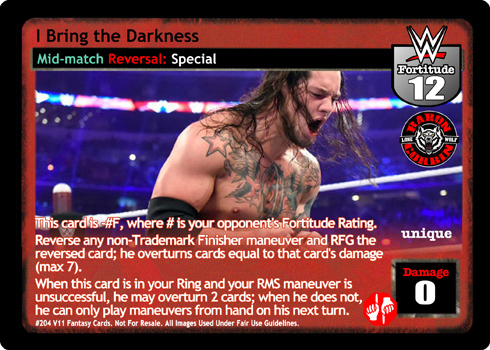This card is -#, where # is your opponent's Fortitude Rating. Reverse any non-Trademark Finisher maneuver and RFG the reversed card; he overturns cards equal to that card's damage (max 7). When this card is in your Ring and your RMS maneuver is unsuccessful, he may overturn 2 cards; when he does not, he can only play maneuvers from hand on his next turn.