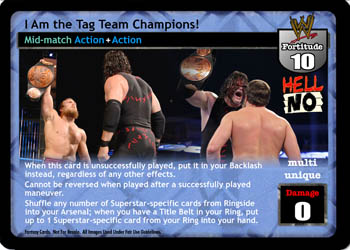 When this card is unsuccessfully played, put it in your Backlash instead, regardless of any other effects. Cannot be reversed when played after a successfully played maneuver. Shuffle any number of Superstar-specific cards from Ringside into your Arsenal; when you have a Title Belt in your Ring, put up to 1 Superstar-specific card from your Ring into your hand.