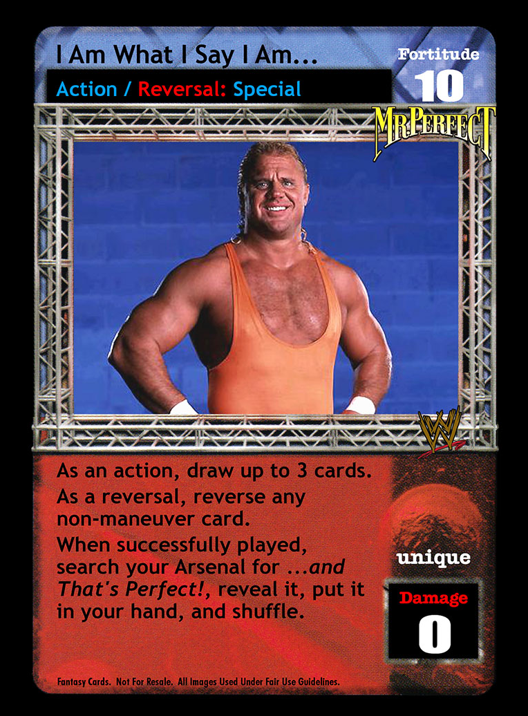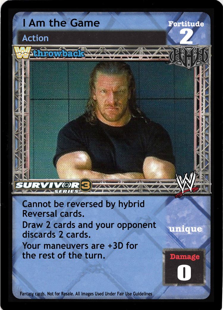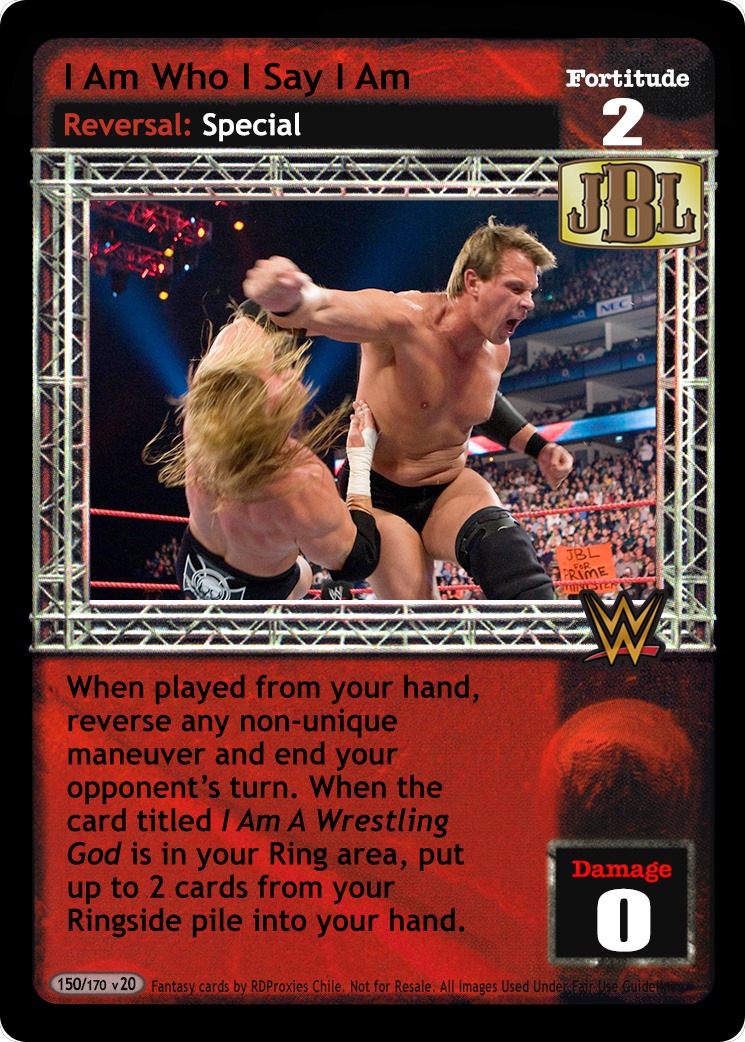 When played from your hand, reverse any non-unique maneuver and end your opponent's turn. When the card titled I Am A Wrestling God is in your Ring area, put up to 2 cards from your Ringside pile into your hand.