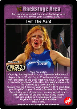 Your Pre-match Capacity, Starting Hand Size, and Superstar Value are +2. Replace 'up to 5' with 'up to 8' in the text of your cards with 'precision' in the title; when you move 7+ cards with a card with 'precision' in the title, it is Multi and can only be reversed by 2 reversal cards. Replace 'the top 5 cards of your Arsenal' with '8 cards from your Ringside' on your Precision Reverse Neck Breaker. Once during each of your turns, you may reveal a card with 'precision' in the title in your hand, shuffle that card and up to 1 random card from your Ringside into your Arsenal and then draw 1 card.