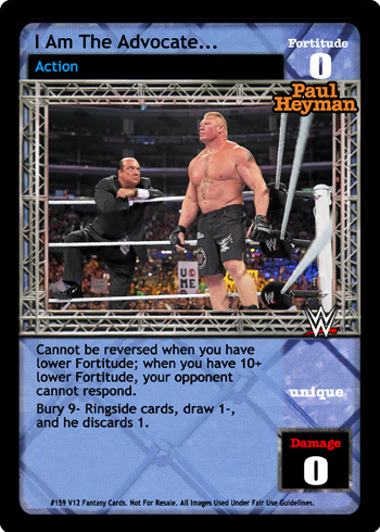 Cannot be reversed when you have lower Fortitude; when you have 10+ lower Fortitude, your opponent cannot respond. Bury 9- Ringside cards, draw 1-, and he discards 1.