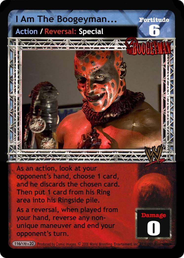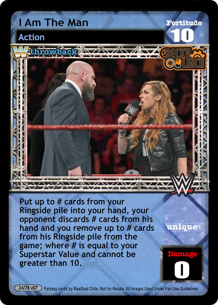 Put up to # cards from your Ringside pile into your hand, your opponent discards # cards from his hand and you remove up to # cards from his Ringside pile from the game; where # is equal to your Superstar Value and cannot be greater than 10.