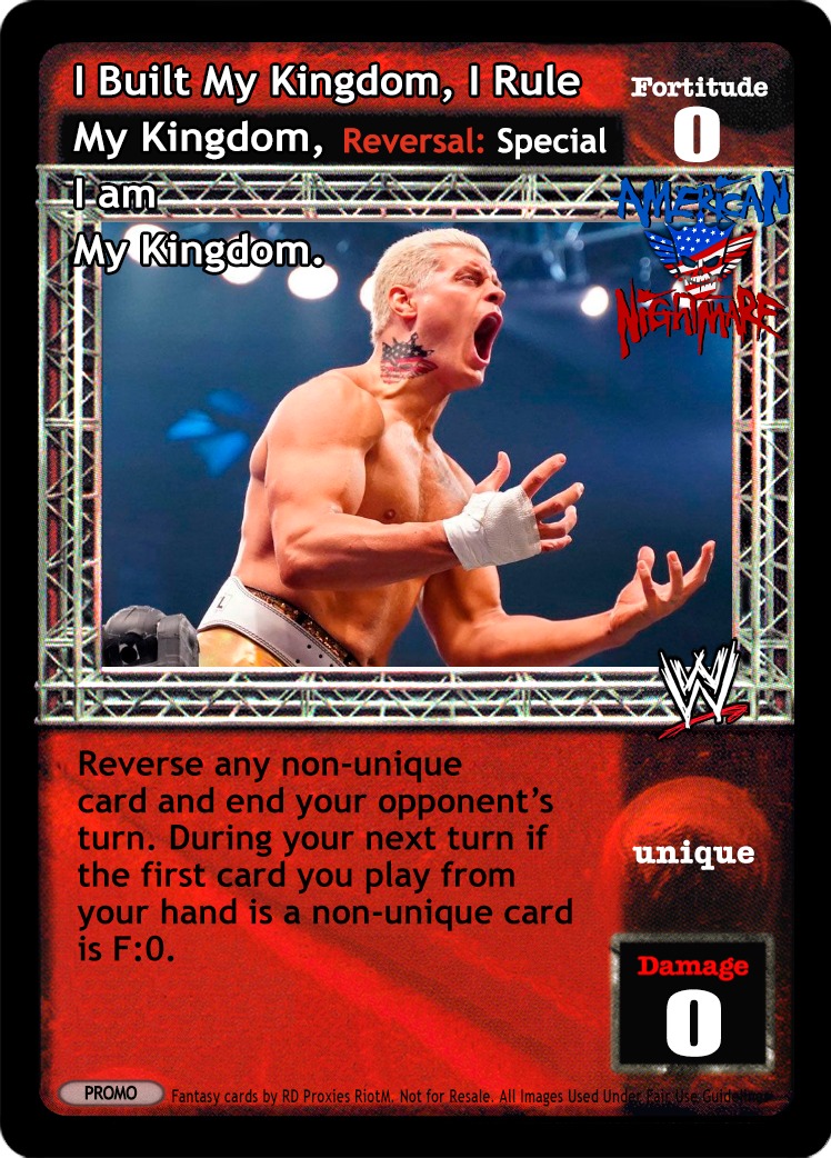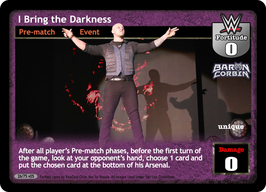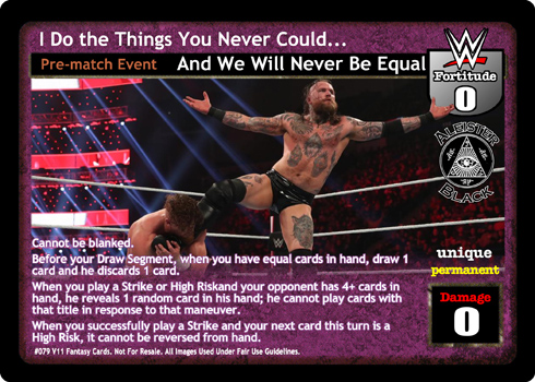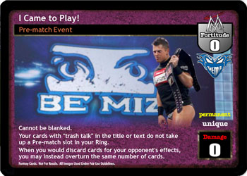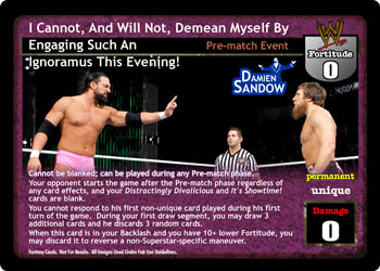 Cannot be blanked; can be played during any Pre-match phase. Your opponent starts the game after the Pre-match phase regardless of any card effects, and your Distractingly Divalicious and It's Showtime! cards are blank. You cannot respond to his first non-unique card played during his first turn of the game. During your first draw segment, you may draw 3 additional cards and he discards 3 random cards. When this card is in your Backlash and you have at least 10 lower Fortitude, you may discard it to reverse a non-Superstar-specific maneuver.