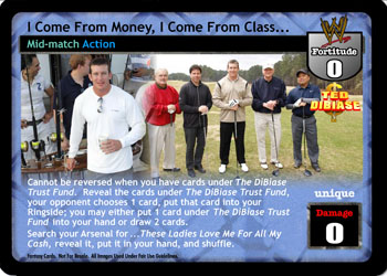Cannot be reversed when you have cards under The DiBiase Trust Fund. Reveal the cards under The DiBiase Trust Fund, your opponent chooses 1 card, put that card into your Ringside; you may either put 1 card under The DiBiase Trust Fund into your hand or draw 2 cards. Search your Arsenal for ...These Ladies Love Me For All My Cash, reveal it, put it in your hand, and shuffle.