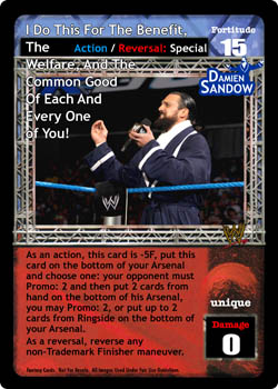As an action, this card is -5F, put this card on the bottom of your Arsenal and choose one: your opponent must Promo: 2 and then put 2 cards from hand on the bottom of his Arsenal, you may Promo: 2, or put up to 2 cards from Ringside on the bottom of your Arsenal. As a reversal, reverse any non-Trademark Finisher maneuver.