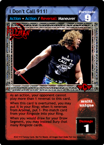 As an action, your opponent cannot play more than 1 reversal to this card. When this card is overturned, you may put it in your Ring; when it reverses from Arsenal, put 1- Ringside Pre-Match cards into your Ring. When you would draw for your Draw Segment, you may instead Bury that many Ringside cards.