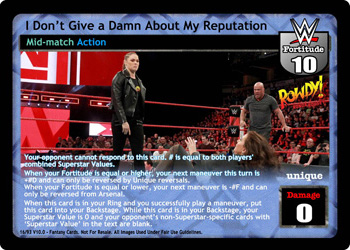Your opponent cannot respond to this card. # is equal to both players' combined Superstar Values. When your Fortitude is equal or higher, your next maneuver this turn is +#D and can only be reversed by Unique reversals. When your Fortitude is equal or lower, your next maneuver is -#F and can only be reversed from Arsenal. When this card is in your Ring and you successfully play a maneuver, put this card into your Backstage. While this card is in your Backstage, your Superstar Value is 0 and your opponent’s non-Superstar-specific cards with ‘Superstar Value’ in the text are blank.