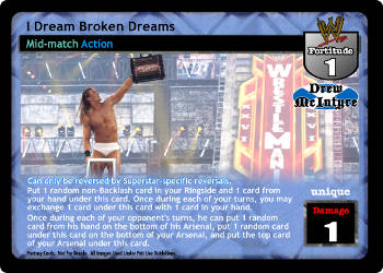 Can only be reversed by Superstar-specific reversals. Put 1 random non-Backlash card in your Ringside and 1 card from your hand under this card. Once during each of your turns, you may exchange 1 card under this card with 1 card in your hand. Once during each your opponent's turn, he can put 1 random card from his hand on the bottom of his Arsenal, put 1 random card under this card on the bottom of your Arsenal, and put the top card of your Arsenal under this card.