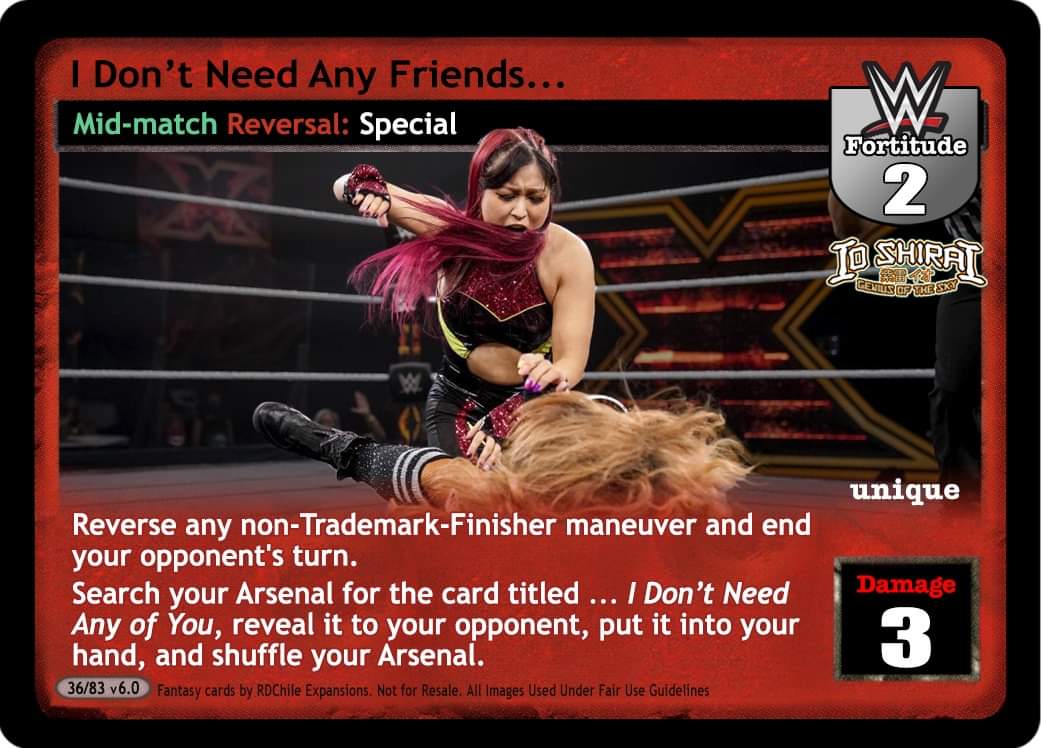 Reverse any non-trademark-finisher maneuver and end your opponent`s turn. Search your arsenal for the card title “… I Don`t Need Any of You”, reveal it to your opponent, put it into your hand and shuffle your arsenal