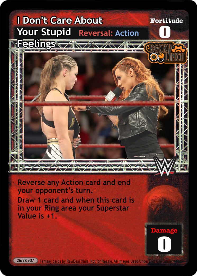 Reverse any Action card and end your opponent's turn. Draw 1 card and when this card is in your Ring area your Superstar Value is +1.