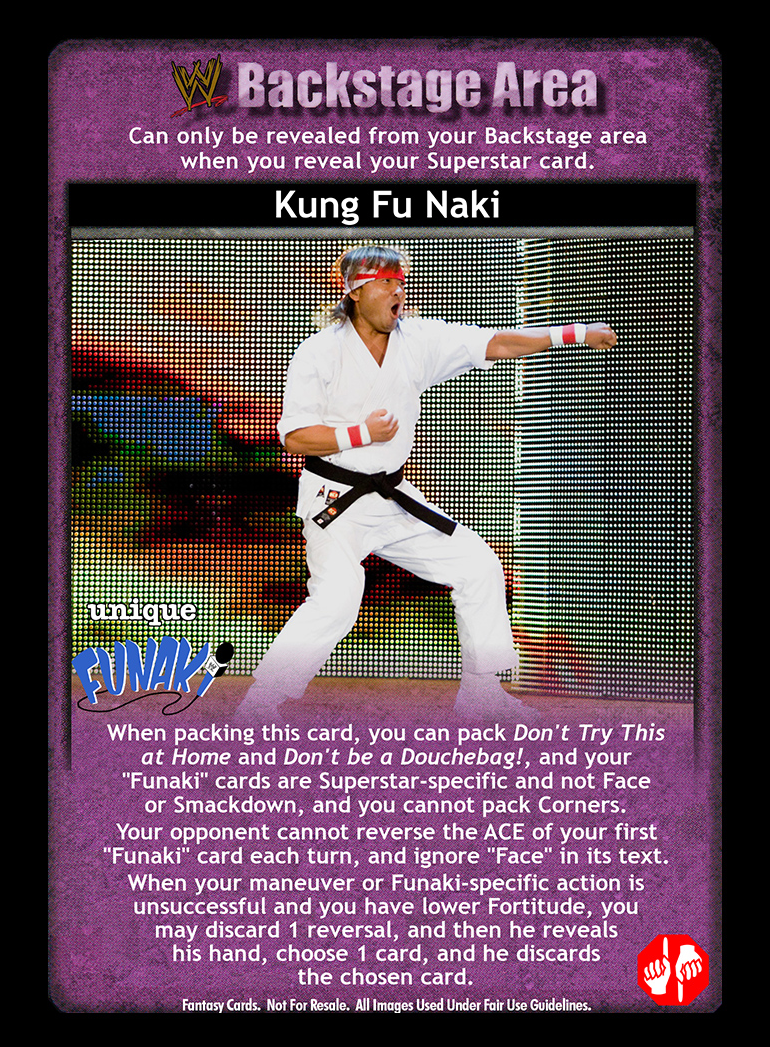 When packing this card, you can pack Don't Try This at Home and Don't be a Douchebag!, and your cards with 'Funaki' in the title are Superstar-specific and can be packed as if they are not Face or Smackdown; but you cannot pack Corners. Your opponent cannot reverse the effect of the first card you Activate each turn with 'Funaki' in the title. When your maneuver or Funaki-specific action is unsuccessful and you have lower Fortitude, you may discard 1 reversal, and then he reveals his hand, choose 1 card, and he discards the chosen card.