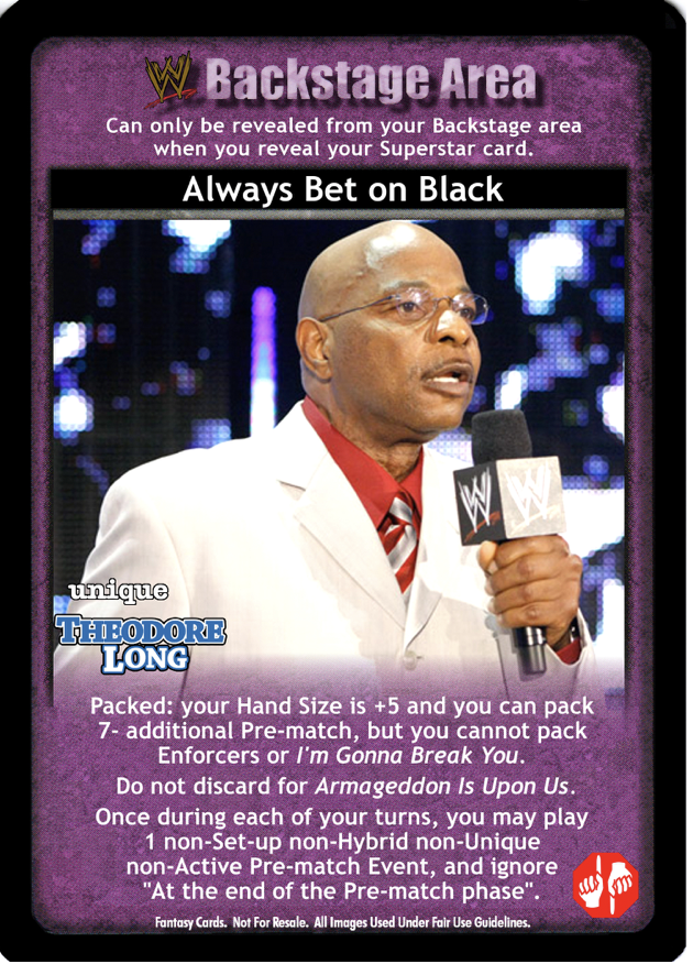 When packing this card, your Starting Hand Size is +5 and you can pack up to 7 additional Pre-match cards, but you cannot pack Enforcers or I'm Gonna Break You. Once during each of your turns, you may play a non-Set-up non-hybrid non-Unique non-Active Pre-match Event, and ignore the 'At the end of the Pre-match phase' text.