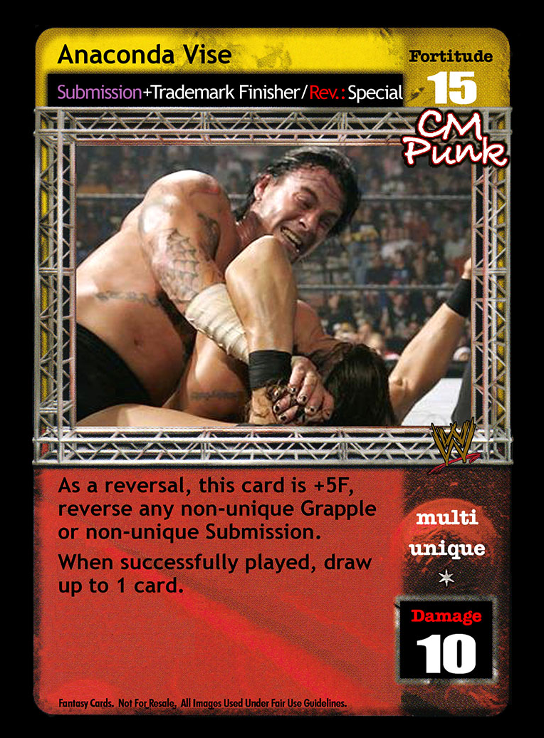 Reverse any non-Trademark Finisher maneuver. Draw up to # cards, where # is the number of cards under your Superstar card. When you have 6+ lower Fortitude and this card reverses from Arsenal, put it under your Superstar card instead.