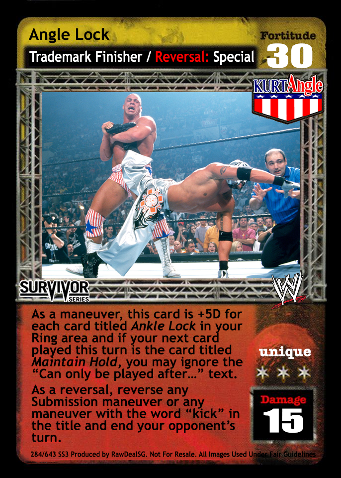 As a maneuver, this card is +5D for each card titled Ankle Lock in your Ring area and if your next card played this turn is the card titled Maintain Hold, you can ignore the "Can only be played after..." text. As a reversal, reverse any Submission maneuver or any maneuver with the word "kick" in the title and end your opponent's turn.