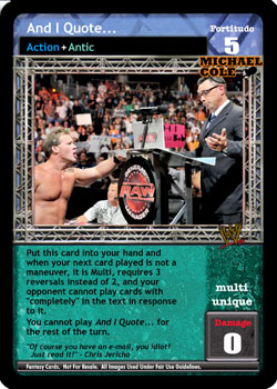 Put this card into your hand and when your next card played is not a maneuver, it is Multi, requires 3 reversals instead of 2, and your opponent cannot play cards with 'completely' in the text in response to it. You cannot play And I Quote... for the rest of the turn.