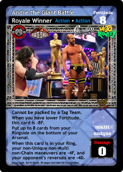 Cannot be packed by a Tag Team. When you have lower Fortitude, this card is -8F. Put up to 8 cards from your Ringside on the bottom of your Arsenal. When this card is in your Ring, your non-Unique non-Multi non-Chain maneuvers are -4F, and your opponent's reversals are -4D.