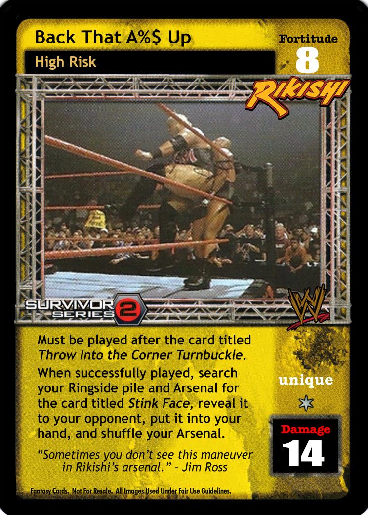 Must be played after the card titled Throw Into the Corner Turnbuckle. When successfully played, search your Ringside pile and Arsenal for the card titled Stink Face, reveal it to your opponent, put it into your hand, and shuffle your Arsenal.