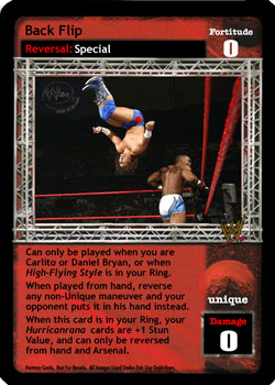 Can only be played when you are Carlito or Daniel Bryan, or when High-Flying Style is in your Ring. When played from hand, reverse any non-Unique maneuver and your opponent puts the reversed maneuver in his hand. When this card is in your Ring, your Hurricanrana cards are +1 Stun Value, and can only be reversed from hand and Arsenal.
