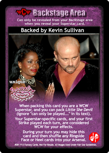 When packing this card you are a WCW Superstar, and you can pack Little She Devil (ignore 'can only be played...' in its text). Your Superstar-specific cards, and your first Strike played each turn are considered WCW for your effects. During your turn you may hide this card and then shuffle any Ringside Face or Heel cards into your Arsenal.
