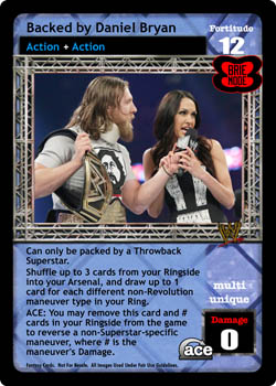 Can only be packed by a Throwback Superstar. Shuffle up to 3 cards from your Ringside into your Arsenal, and draw up to 1 card for each different non-Revolution maneuver type in your Ring. ACE: You may remove this card and # cards in your Ringside from the game to reverse a non-Superstar-specific maneuver, where # is the maneuver's Damage.