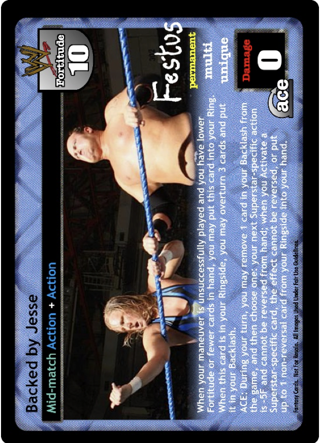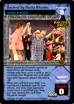 When your maneuver is unsuccessfully played and you have lower Fortitude or fewer cards in hand, you may put this card into your Ring. When this card is in your Ringside, you may overturn 3 cards and put it in your Backlash. ACE: During your turn, you may remove 1 card in your Backlash from the game, and then choose one: your next Superstar-specific action is -5F and cannot be reversed from hand; when you activate a Superstar-specific card, your opponent cannot reverse that effect, or put up to 1 non-reversal card from your Ringside into your hand.