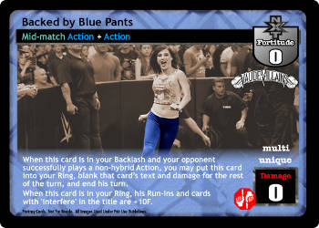 When this card is in your Backlash and your opponent successfully plays a non-hybrid Action, you may put this card into your Ring, blank that card's text and damage for the rest of the turn, and end his turn. When this card is in your Ring, his Run-ins and cards with 'interfere' in the title are +10F.