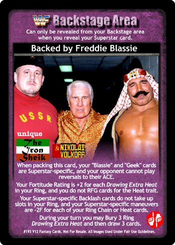 When packing this card, your 'Blassie' and 'Geek' cards are Superstar-specific, and your opponent cannot play reversals to their ACE. Your Fortitude Rating is +2 for each Drawing Extra Heat in your Ring, and you do not RFG cards for the Heat trait. Your Superstar-specific Backlash cards do not take up slots in your Ring, and your Superstar-specific maneuvers are -2F for each of your Ring Chain or Heat cards. During your turn you may Bury 3 Ring Drawing Extra Heat and then draw 3 cards.