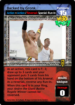 As an action, this card is F: 3; draw up to 3 cards and your opponent puts 3 cards from his hand on the bottom of his Arsenal. As a reversal, reverse any Run-in. When this card is in your Ring, your Andre the Giant Battle Royale Winner cannot be reversed.