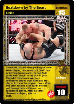 Cannot be packed when packing a Corner. When played, choose up to 2 Chair Shot or 2 German Suplex cards, or 2 non-Multi cards with 'punch' in the title in your Ringside; those maneuvers are considered played from your hand and are played in the order of your choice after this card, resolve each card's effects and damage before the next card is considered played. After all cards chosen are played, your turn ends.