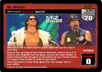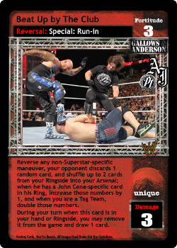 Reverse any non-Superstar-specific maneuver, your opponent discards 1 random card, and shuffle up to 2 cards from your Ringside into your Arsenal; when he has a John Cena-specific card in his Ring, increase those numbers by 1, and when you are a Tag Team, double those numbers. During your turn when this card is in your hand or Ringside, you may remove it from the game and draw 1 card.