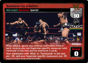 When played, ignore any reversal restrictions from a card; reverse any non-Superstar-specific maneuver with 'reversed' in the text and he overturns 4 cards. Your maneuvers with 'Whip' or 'Turnbuckle' in the text are +3D, and your Superstar-specific maneuvers are -5F.