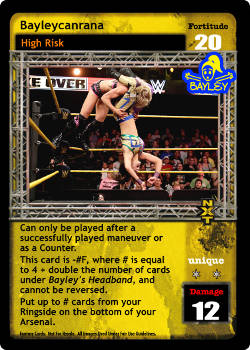 Can only be played after a successfully played maneuver or as a Counter. This card is -#F, where # is equal to 4 + double the number of cards under Bayley's Headband, and cannot be reversed. Put up to # cards from your Ringside on the bottom of your Arsenal.