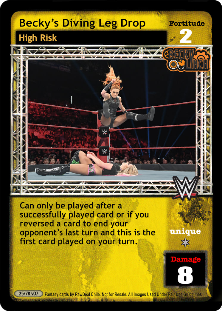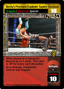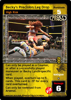 Can only be played as a Counter, or after a successfully played maneuver or Becky Lynch-specific card. When played, overturn up to 5 cards. This card is -1F for every card overturned. Can only be reversed from Arsenal.