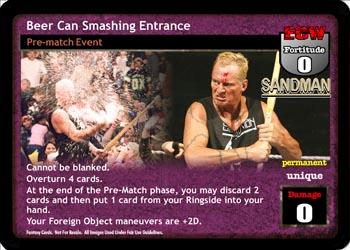 Can be played during any Pre-match Phase, can be played from Ringside, and your opponent cannot prevent you from playing this card. When you do not have a D: 1+ Pre-match card in your Ring, your Fortitude Rating is +1 for every card with 'hype' in the title in your Ring. When the first card played during your turn is a non-Chain, non-Unique maneuver, your opponent must put 1 card from his hand on the bottom of his Arsenal in order to play reversals to it.