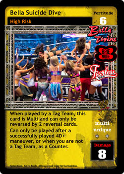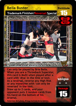 Can only be played by Brie Bella. When you are a Throwback Superstar, this card is Multi when played after a card with 'diva' in the title or text. As a reversal, reverse any High Risk or any maneuver with 'can only be reversed' in the text. Draw up to 2 cards, and your opponent puts 2 random cards from his hand on the bottom of his Arsenal.