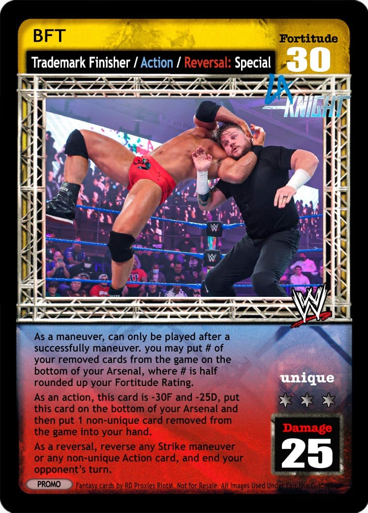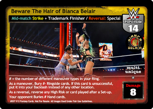 as a maneuver, can only be played after a successfully played card as a reversal, reverse any high risk maneuver or any unique card, and end your opponent's turn when successfully played, put 1 mid-match card from your ringside pile into your backlash deck, or put 1 card removed from the game into your hand