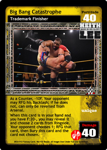 When played after a successfully played maneuver or as a Counter, your opponent must remove 1 card in his hand from the game to reverse to this card from hand or Backlash. Shuffle cards from your Ringside into your Arsenal up to the total number of cards removed from the game (up to 10 maximum).