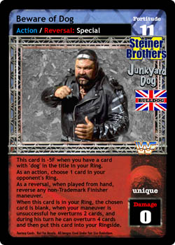 This card is -5F when you have a card with 'dog' in the title in your Ring. As an action, choose 1 card in your opponent's Ring. As a reversal, when played from hand, reverse any non-Trademark Finisher maneuver. When this card is in your Ring, the chosen card is blank, when your maneuver is unsuccessful he overturns 2 cards, and during his turn he can overturn 4 cards and then put this card into your Ringside.