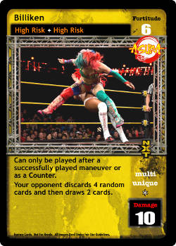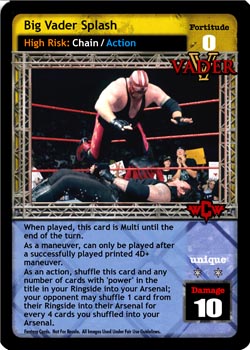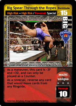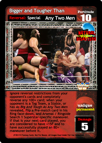 Ignore reversal restrictions from your opponent's cards and completely reverse any 10D+ card; when your opponent is a Tag Team, a Stable, or has As Big And Tough As Any Two Men revealed, flip a Pre-match card in his Ring face-down, and Arsenal / Ringside Search 1 Superstar-specific maneuver. If that is your next card played, you are considered to have +15F and to have successfully played an 8D+ maneuver before it.