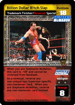 When you are Stephanie McMahon, this card is -10F and cannot be reversed from Backlash. As a reversal, reverse any non-unique non-Superstar-specific non-maneuver card. When you are Stephanie McMahon, reverse any non-maneuver card instead.