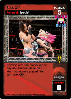 Requirement: Alexa's Playground is in your Ring. As a Reversal, reverse any Superstar-specific maneuver. When this card is in your Ringside or RFG, during your turn you may RFG your top 2 Arsenal cards and then put this card into your Backstage.